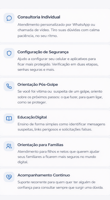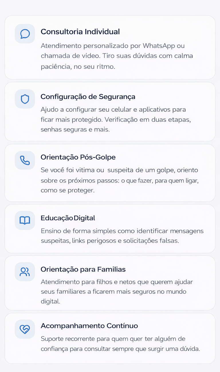 Ajudo você ou seus familiares a usar o celular, WhatsApp e a internet com mais segurança e menos riscos. Atendimento humano e compreensivo feito por um especialista.