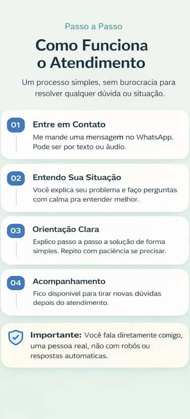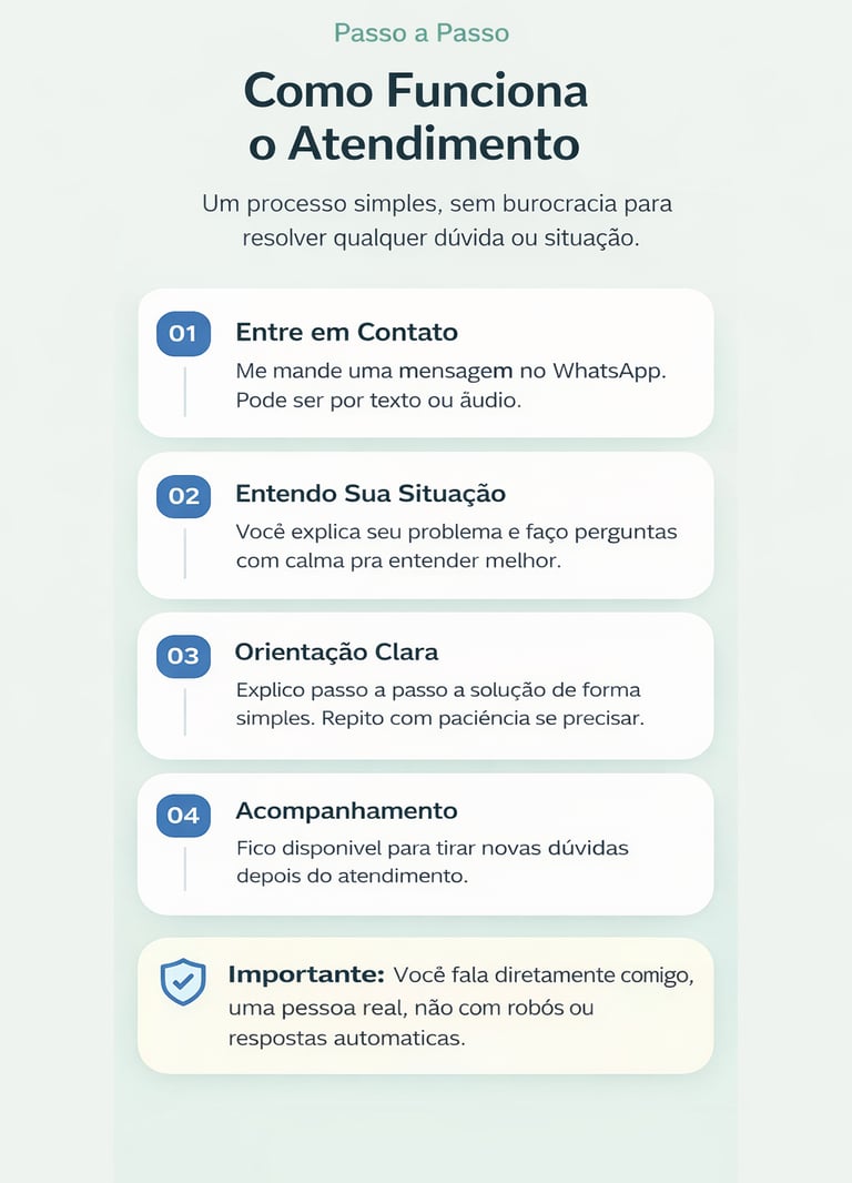 Ofereço diferentes formas de atendimento, sempre com foco em explicar de forma clara e sem pressa.